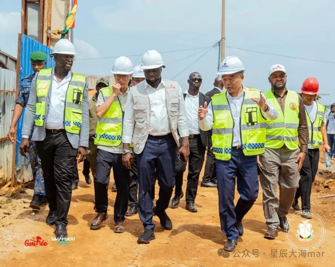 科纳克里近海的碧海蓝天之间,巨大的绞吸船正将海底的沙料通过长长的管道喷涌上岸,描绘着一幅“向海图强”的壮丽画卷。2025年10月27日,几内亚城市规划、住房与国土整治部莫里·孔戴(Mory Conde)部长率部委秘书长、规划局、建设局、测绘局局长等核心班子成员深入科纳克里新城项目现场,实地考察这一关乎几内亚国家战略的重大工程进展情况,并就项目规划与建设进行现场指导。